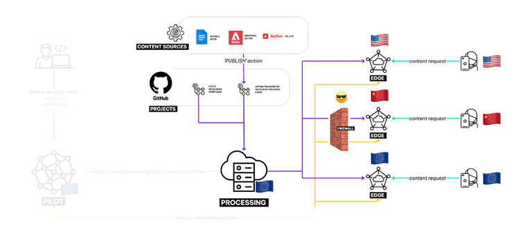 - Mesh of clusters. The architecture contains three cluster types: a pilot cluster (control plane) that defines projects and deployments, a processing cluster (data plane) that receives content from AEM/EDS/Magento and prepares it, and multiple edge clusters distributed globally, including at least one in mainland China. Edge clusters serve processed content directly to local users, ensuring that Chinese requests never cross the firewall.