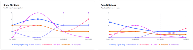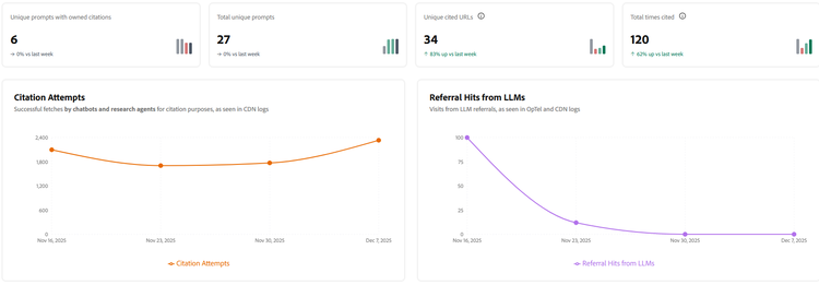 When an AI chatbot or research agent is searching for information they tend to group many pages as potential sources to be cited. These are called citation attempts and even if your page is not used as a final source, it is an important metric of visibility. Comparing citation attempts to referral traffic can tell you how effective the citations are at generating real user visits to your content.