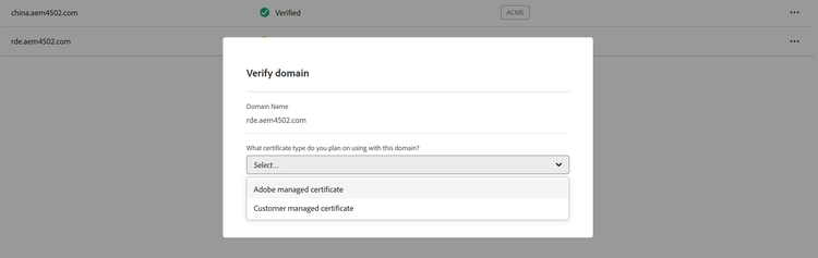 (2) Aggiungi il certificato SSL: una volta verificato la proprietà di un dominio, puoi aggiungere un certificato SSL per quel dominio. Puoi usare un certificato gestito da Adobe oppure un certificato tuo se preferisci. Nota che Cloud Manager popolerà solo i domini che hai verificato.