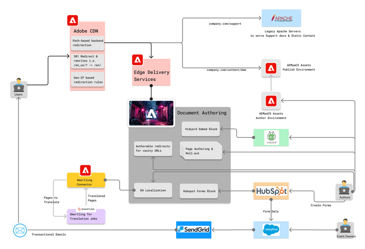 W powyższej architekturze DA pełni rolę CMS i powierzchni autorskiej oraz punktu integracji działań związanych z zarządzaniem dokumentami, takich jak taksonomia, zarządzanie zasobami i tłumaczenia. Zazwyczaj NIE jest to jednak centralny punkt integracji danych zaplecza lub danych publicznych w sposób, w jaki może być tradycyjny autor AEM.