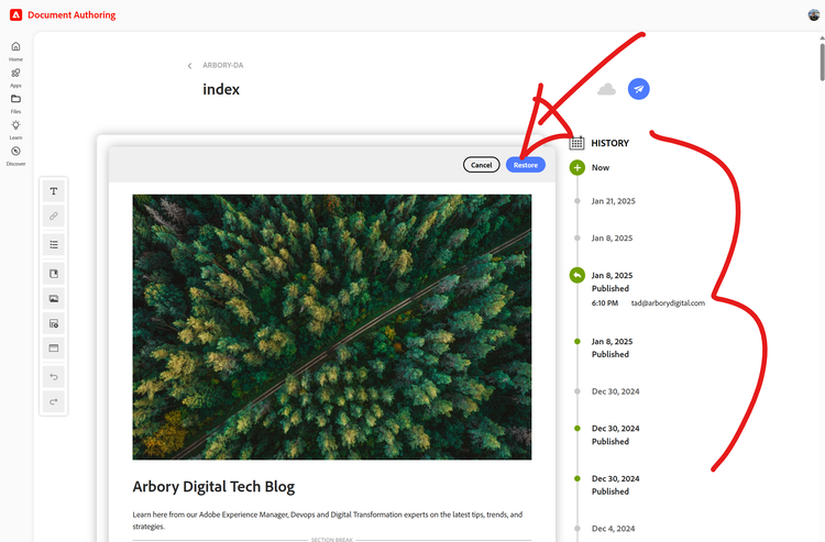 DA posiada wbudowaną funkcję wersjonowania dokumentów i historię audytów. Każda zmiana wprowadzona do dokumentu przez dowolnego użytkownika jest kontrolowana za pomocą sygnatury czasowej zawierającej datę i godzinę ( & ), a wersjonowanie punktów przywracania odbywa się automatycznie przy każdej publikacji strony lub ad hoc w dowolnym momencie, w którym chcesz utworzyć punkt przywracania.