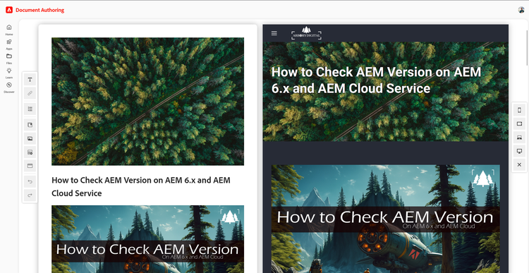 DA zawiera edytor dokumentów & owy edytor arkuszy do dokumentów internetowych, a także danych ustrukturyzowanych. Edytor jest prosty i niezwykle szybki, zawiera menu skrótów do szybkich funkcji formatowania & oraz bibliotekę bloków umożliwiającą szybki dostęp do bloków (np. "Komponenty" w starym języku AEM), które utworzyłeś w swoim projekcie.