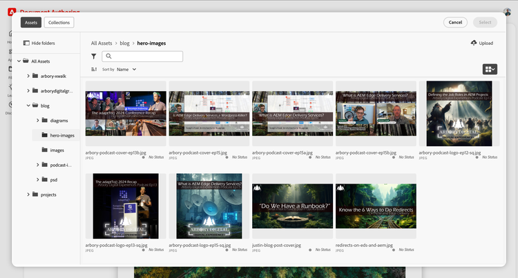 DA zawiera wbudowaną integrację z AEM Assets za pomocą AEM Assets Micro Frontend (MFE). Dzięki temu organizacja może nadal korzystać z AEM Assets jako centralnego systemu rejestracji zasobów cyfrowych, a autorzy zyskują swobodę pracy w szybkim systemie Edge Delivery opartym na dokumentach.