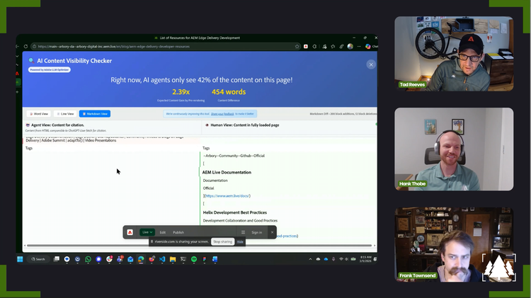 Przykładem, który omawialiśmy w podcaście, była ta strona zasobów usług Edge Delivery, na której używamy prostego podejścia opartego na arkuszach danych do agregowania witryn Adobe Edge Delivery w arkuszu kalkulacyjnym i wyświetlania tych danych na stronie. Jedyny problem - 100% SUBSTANTYWNYCH treści na stronie, które chciałbyś pokazać LLM, było dla nich KOMPLETNIE NIEWIDOCZNE. Można to sprawdzić za pomocą świetnej wtyczki AI Visibility Checker wydanej przez Adobe (link poniżej).