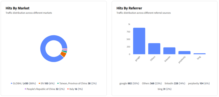 您的內容被 AI 引用固然很好,但最重要的還是終端使用者瀏覽您的網站。Referral Traffic(推薦流量)可確實顯示按搜尋方式和地區劃分的推薦流量。這可以讓您更了解您的內容在哪些地方表現良好,無論是 Google、LinkedIn、Perplexity 等。