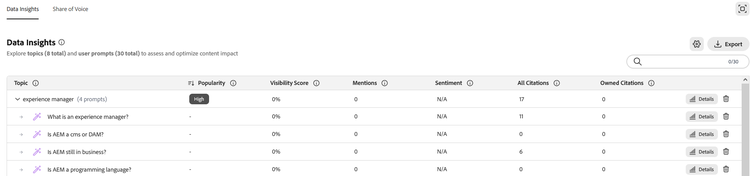 Adobe 的 LLM Optimizer 可讓您清楚瞭解您的品牌如何在 AI 驅動的搜尋中出現。您可以追蹤 AI 何時、何地提及您,並獲得可追蹤一段時間的能見度評分,瞭解您在產生式引擎中與競爭對手的差距,並找出真正的聲音佔有率差距。它也會浮現可操作的機會,從常見問題與模式等內容修正,到可抓取性等技術問題,都直接與提升引文有關。除此之外,您還可以透過監控來自 AI 助手的流量和來自 AI 生成的引文的點擊來衡量實際影響。為了讓每個人保持一致,團隊可以共用儀表板、指派負責人,並在一個地方追蹤 SEO、行銷和通訊的可見性目標。