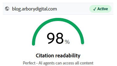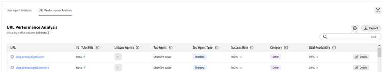 這是最重要的檢視之一,因為它可以量測和監控 AI 流量的互動和模式。它概述了您的網站被所有非人類流量請求的次數,以及成功率和到第一個位元組的時間 (TTFB)。它也提供可讀性評分,反映 LLM 能夠解析您內容的程度。這可能會發現一些問題,例如大量 JavaScript 會導致爬行速度變慢或無法爬行。