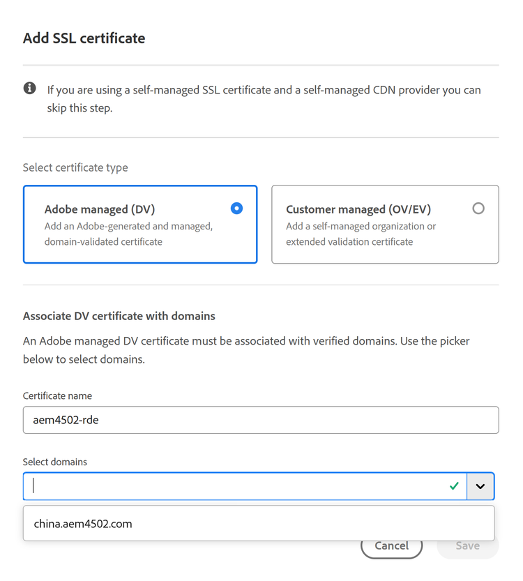 (2)新增 SSL 憑證: 驗證網域的擁有權後,您就可以為該網域新增 SSL 憑證。您可以使用 Adobe 管理的憑證,或者您自己的憑證(如果您喜歡)。請注意,Cloud Manager 只會填入您已驗證的網域。